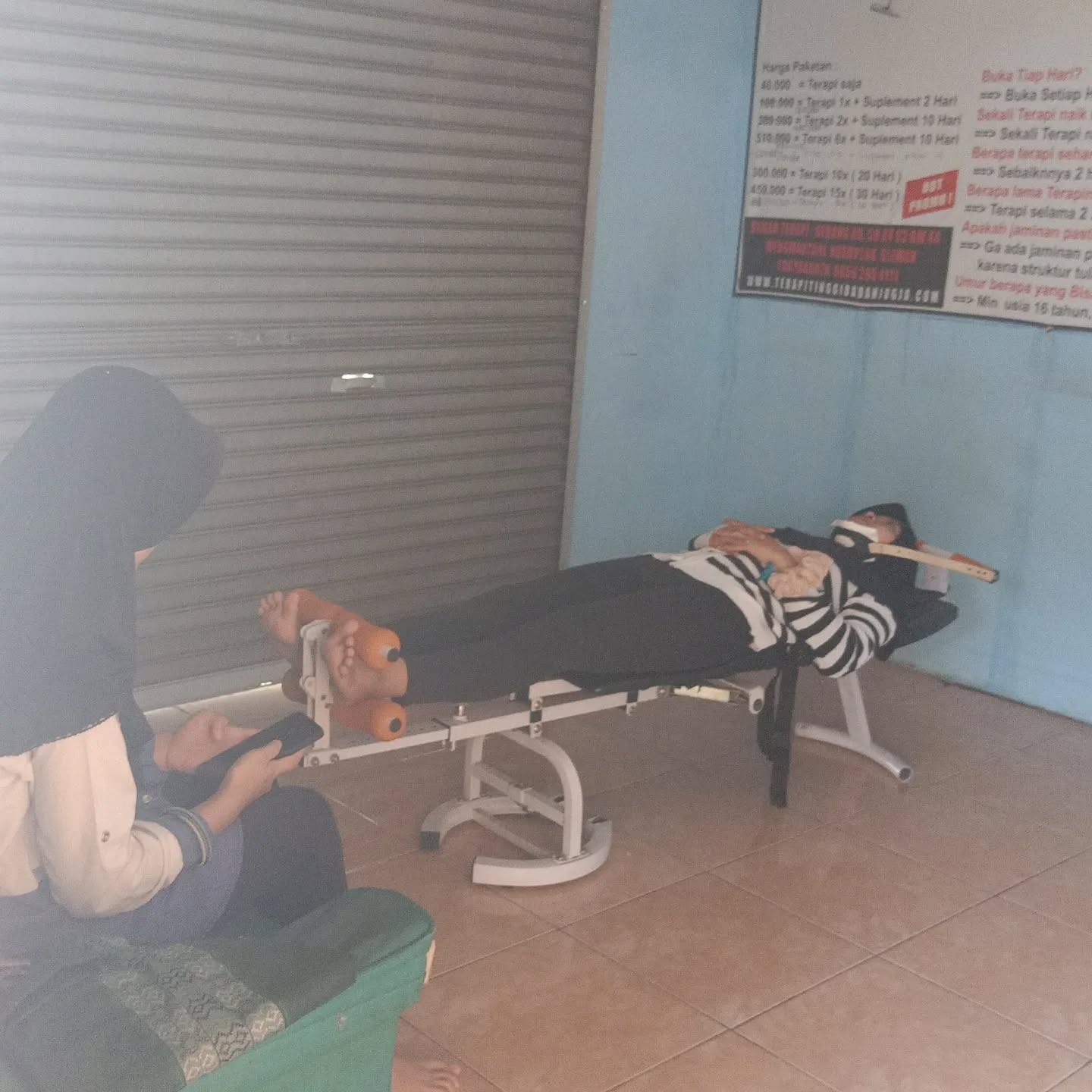 Peserta terapi berbaring di atas Jaco Therapy Bed dengan posisi yang sudah diatur sesuai panduan terapis. - Proses Tarikan Peregangan